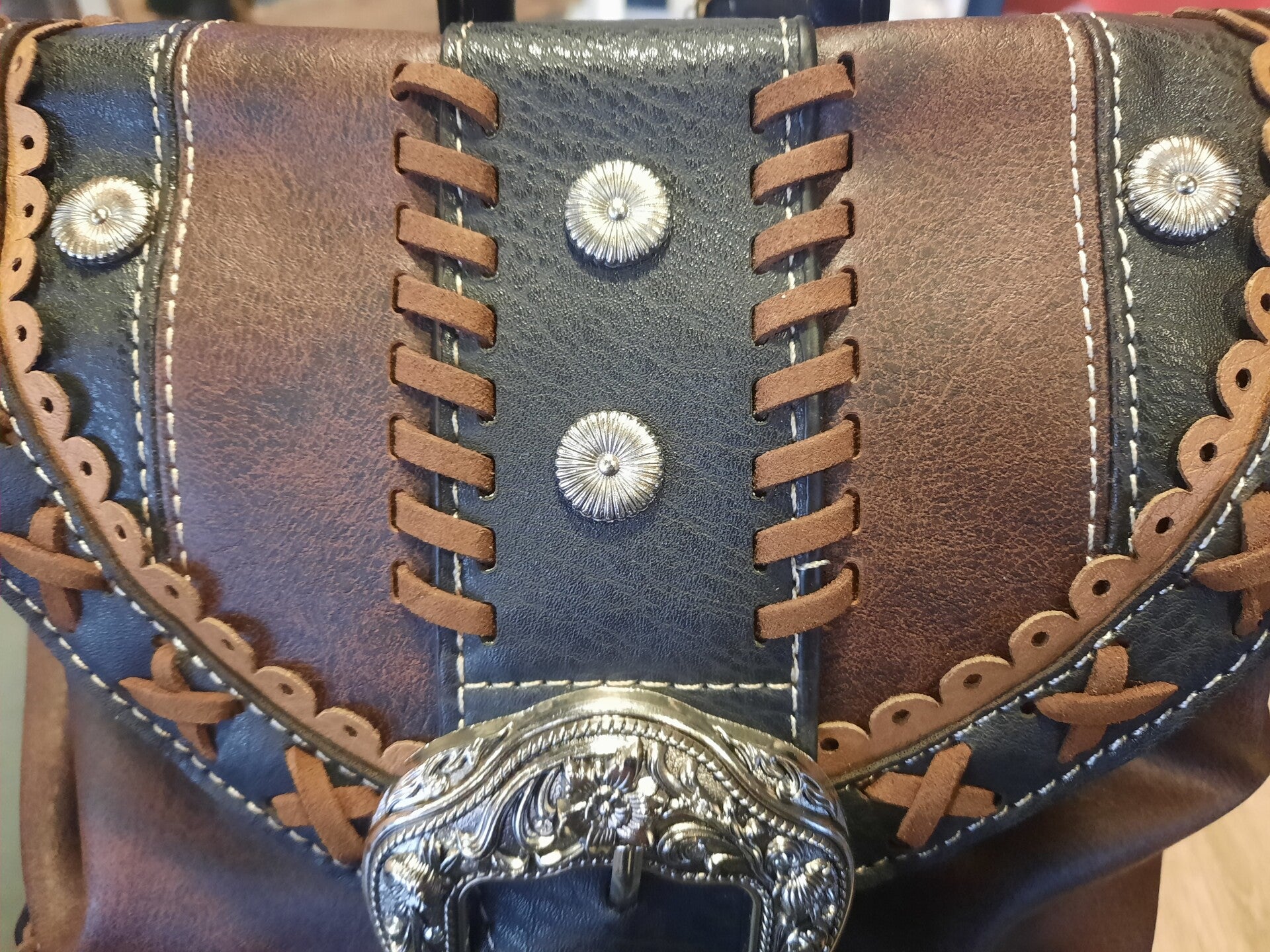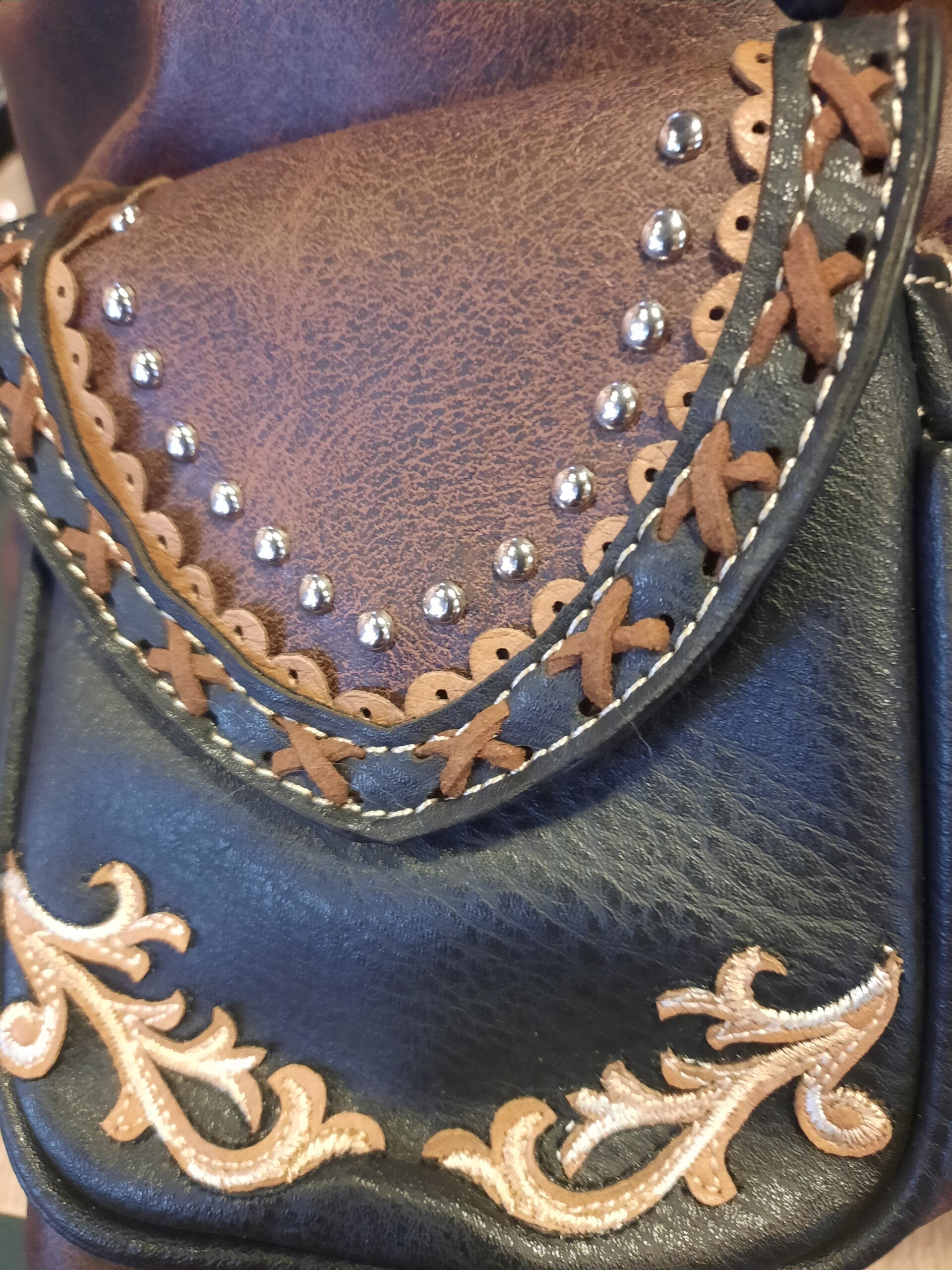 Western Leather Backpack is een functionele rugzak, een rugzak perfect voor dagelijks gebruik met een westerse country-flair. Versierd met strass-steentjes, concho's ,Westers bloemen-borduurwerk , Magnetische klepsluiting met riemgesp.