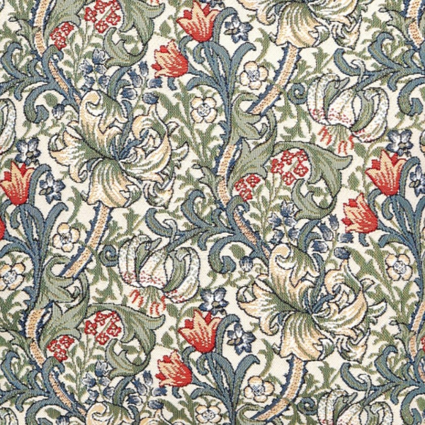 De opvallende Gobelin seizoensstof van verstrengelde leliebloemen, stengels en ranken creëert een bloemstuk dat is ontworpen om goed te passen bij zonovergoten pastelkleurenschema's.