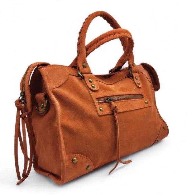 Deze luxe Italiaanse tas van premium suède leer in Arancio onderscheidt zich door zijn tijdloze elegantie en verfijnd ontwerp, geïnspireerd door grote luxemerken.